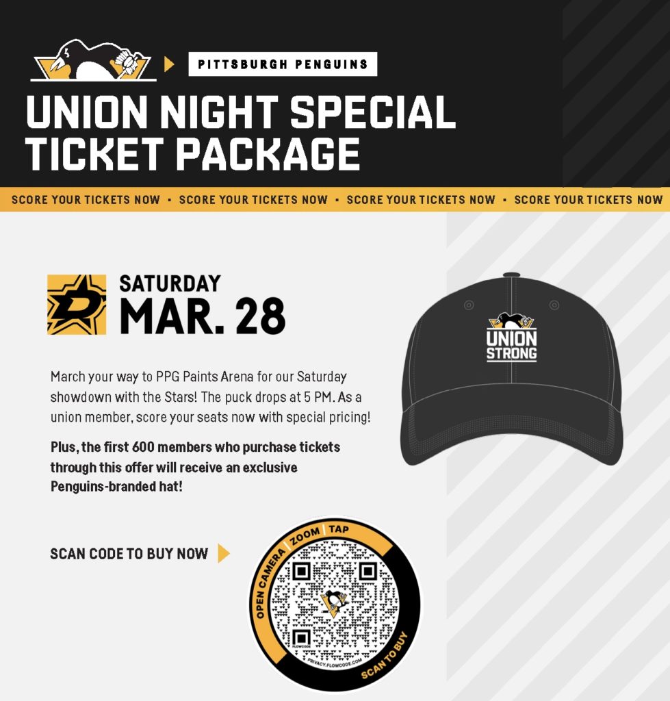 The Penguins are hosting their fourth annual Union Night on March 28th against the Dallas Stars. Show your Pittsburgh and union pride by grabbing discounted tickets and cheering on the Pens as they march towards the playoffs! https://www.gofevo.com/event/PenguinsUnion032826?access_code=PenguinsUnion032826&area=&ref=WILL.